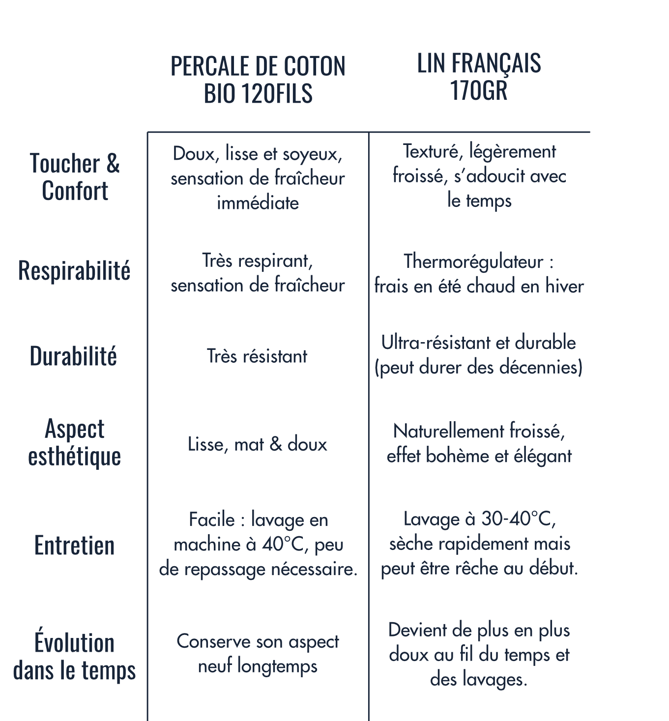 Avec notre tisseur vosgien, nous avons mis au point un tissage premium de 120 fils, bien au-delà des standards du marché (80 fils). Ce tissage serré offre une douceur incomparable et une durabilité accrue, pour un linge de lit qui traverse les années sans perdre son confort.
